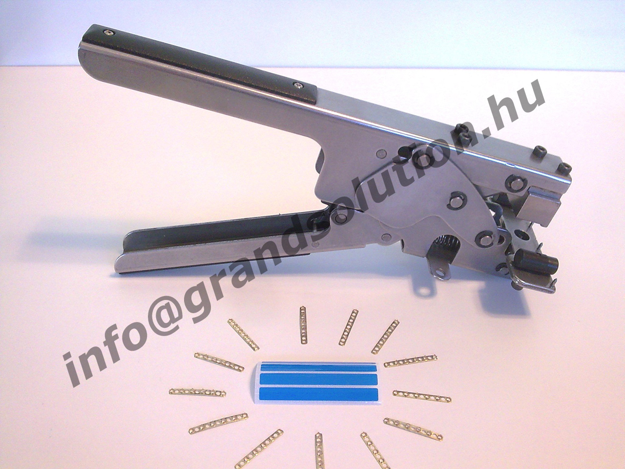The splicing scissors have a specially designed “Pin Plate” with two pins in two rows used for different component sizes.